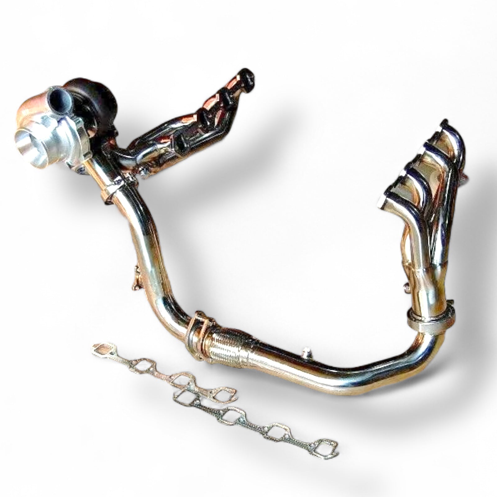 Brand new “street” single turbo hot part package for 5.0 Ford engines. Kit includes headers, crossover and T4 turbo unit. This package has all new quality parts that is capable of producing MASSIVE horsepower with supporting modifications. also fits a 351w if the user uses a short oil filter or oil filter relocation kit.
